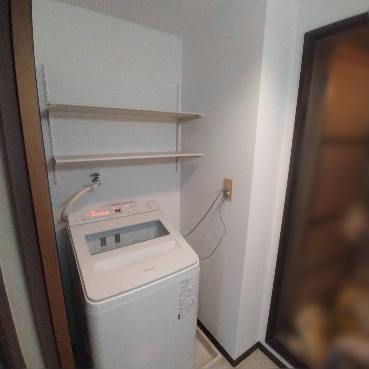 既存撤去、処分、新規取付、洗濯機背面棚取付・下地