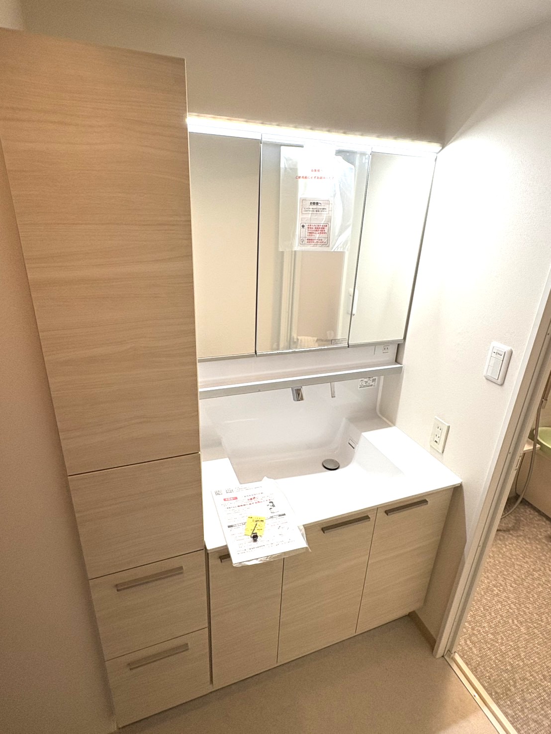 洗面台の横にスリムな収納キャビネットを設置。化粧品やタオル、小物などをすっきり整理でき、スペースを有効活用できます。